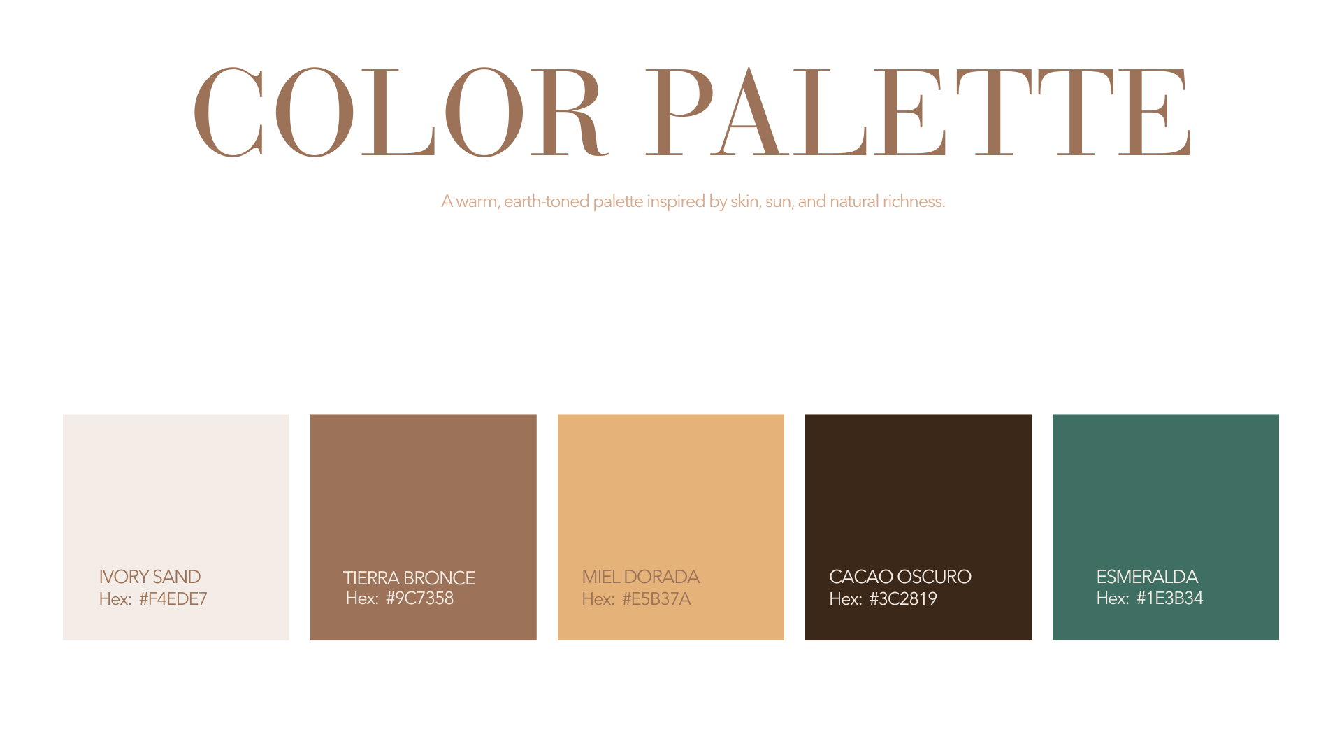 The visual identity balances warmth and refinement, drawing from sunlit skin, natural textures, and understated elegance to create a cohesive and modern brand system.